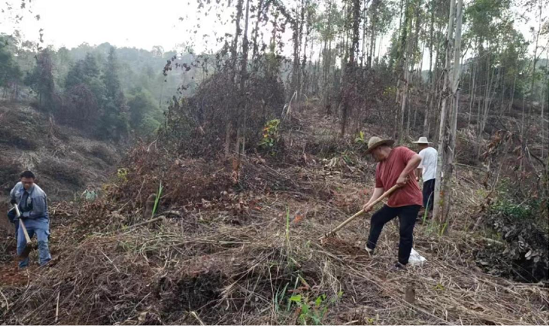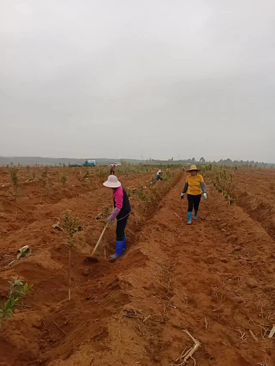 石岭林场分公司工作人员进行开沟、松土、种植沉香树苗