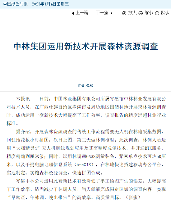 编者按:中林集团作为林业行业的唯一央企,充分发挥着中央企业在科技创新、绿色发展中的引领带动作用。2023年1月4日,《 中国绿色时报》推出报道《中林集团运用新技术开展森林资源调查》,介绍中林集团科技兴林故事。新闻分享如下: