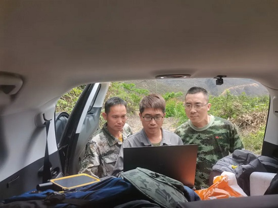 (生产部梁锦明、郭建平、吴天顺将越野车后备箱当临时移动办公桌,即时处理航拍图片。)
