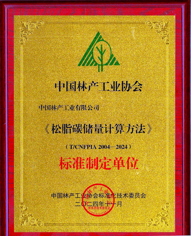 2024年度,中林集团所属中国林产工业有限公司积极落实集团战略部署,始终坚持聚焦主责主业,持续改革创新,助力中林品牌向智能化、绿色化转型升级。作为中国林产工业协会松香分会理事长单位,林产公司牵头组织全国松香行业重点企业和科研院所制订的《松脂碳储量计算方法》和《脂松香和脂松节油碳足迹评价指南》两项团体标准于2024年11月正式发布。