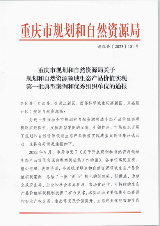 近日,重庆市规划和自然资源局公布了重庆市规划和自然资源领域生态产品价值实现第一批典型案例和优秀组织单位,中林集团所属重庆市林业投资开发有限责任公司荣誉上榜,被认定为第一批典型案例。