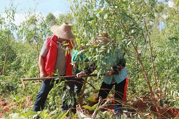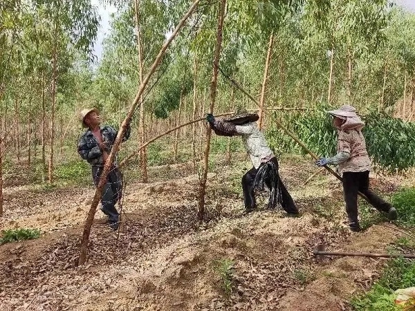 △ 遂溪林场梁家林队一线工人扶正倒伏的幼林