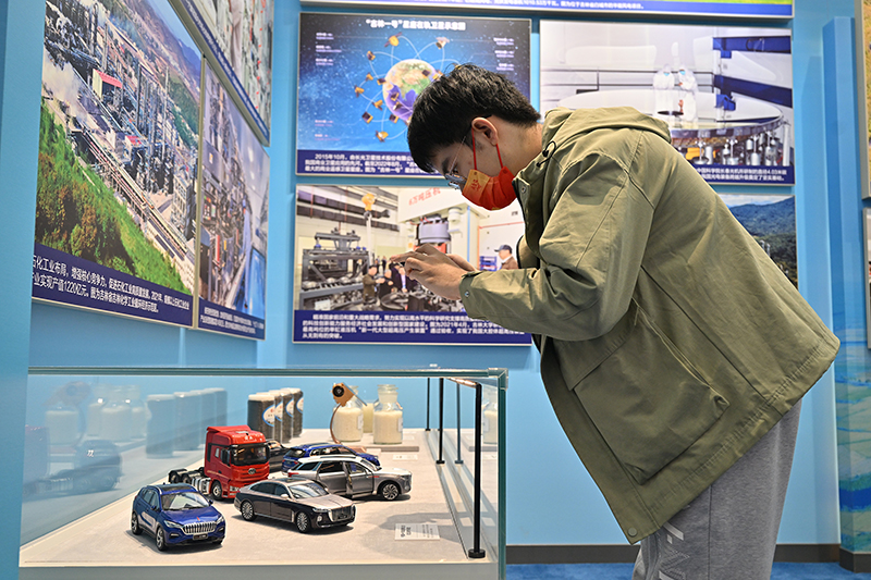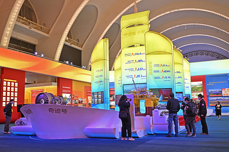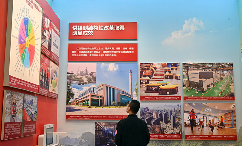 新华社北京10月8日电 题:非凡的变革 巨大的跨越——从“奋进新时代”主题成就展看新时代经济建设 新华社记者 赵文君、戴小河、王琳琳 党的十八大以来,以习近平同志为核心的党中央高瞻远瞩、统揽全局、把握大势,提出一系列新理念新思想新战略,引领我国经济发展取得历史性成就、发生历史性变革。 在党的二十大即将召开之际,“奋进新时代”主题成就展全景式、多角度展现了这十年我国经济建设的巨大变化与崭新面貌。 我国经济发展迈上新台阶、取得新成就 10月8日,一名观众在中央综合展区内参观拍摄中国经济“奇迹”号巨轮模型。新华社记者 李鑫 摄 在中央综合展区经济建设主题区,一艘中国经济“奇迹”号巨轮模型展示了这十年的发展成就: 国内生产总值从53.9万亿元增长到114.4万亿元;居民人均可支配收入从1.65万元增长到3.51万元;货物进出口总额从24.4万亿元增长到39.1万亿元;制造业增加值从16.98万亿元增加到31.4万亿元…… 在习近平经济思想的科学指引下,坚持新发展理念,中国经济迈上更高质量、更有效率、更加公平、更可持续、更为安全的发展之路。 一张柱状图展示了2012年至2021年财政收入情况,全国一般公共预算收入从11.73万亿元增长到20.25万亿元。十年来,我国财政政策效能提升,更加注重精准、可持续、支撑经济社会发展的能力明显增强。 10月8日,一名观众在中央综合展区内拍摄中国经济“奇迹”号巨轮模型。新华社记者 李鑫 摄 银行工作人员到贷款企业上门服务、税务部门工作人员辅导企业员工办理减税降费业务,展览中讲述的一个个百姓身边事,让经济发展的强劲脉动变得更加可知、可感。 持续推进减税降费,2012年以来新增减税降费金额超过8.8万亿元,用政府收入的“减法”换取企业效益的“加法”和市场活力的“乘法”。金融支持实体经济力度增强。截至今年4月末,全国小微企业贷款余额38.8万亿元,是2012年末的3.35倍。 黑龙江展区筑牢国家粮食安全“压舱石”单元引人注目,北大荒农垦集团大豆收储的丰收场景喜人。 保持宏观政策连续性针对性,各项政策协同发力,粮食、能源等重要物资保供稳价有力有效,我国经济基本盘进一步稳固。 10月8日,一名观众在河南展区观看河南省西平县老王坡高标准农田示范区开镰仪式的图片。新华社记者 李鑫 摄 扛稳粮食安全重任,粮食产量连续7年稳定在1.3万亿斤以上。近十年来,我国以年均约2.9%的能源消费增长支撑了6.2%的国民经济增长;发电装机超过24亿千瓦,人均电力装机由2014年的1千瓦增长至1.7千瓦。 疫情要防住、经济要稳住、发展要安全。扎实做好“六稳”工作,全面落实“六保”任务,制定一系列纾困惠企政策,出台多项强化就业优先、促进投资消费、稳定外贸外资、稳定产业链供应链等措施。 亿户市场主体是稳经济的底气所在。全国市场主体突破1.6亿户,带动就业近3亿人,2013年以来新增的涉税市场主体去年纳税达到4.76万亿元,这有力印证了我国经济的强大韧性。 “十四五”实现良好开局,2022年上半年国内生产总值同比增长2.5%,二季度经济实现正增长,6月份开始主要经济指标全面回升……高效统筹疫情防控和经济社会发展工作,我国成为疫情发生以来第一个恢复增长的主要经济体。 经济发展内生动力和活力不断增强 河钢集团智能无人化料场里看不到一名工人,取料机正在进行取料作业;杭钢云计算数据中心成为钢铁基地转型的重大落地项目;山东省兖州矿业集团北宿煤矿转型为兖煤蓝天洁净能源有限公司……一幅幅照片记录了各地去产能、调结构的火热实践。 我国经济发展进入新常态,创新发展、新旧动能转换,是经济能够爬坡过坎的关键。以供给侧结构性改革为主线,落实巩固、增强、提升、畅通要求,供给体系质量不断提高,供给结构对需求变化的适应性和灵活性明显增强,实现更高水平上的动态平衡。 10月8日,一名观众在中央综合展区内观看供给侧结构性改革取得明显成效的展览内容。新华社记者 李鑫 摄 一汽解放重型卡车在吉林省长春市总装下线,再次见证了一汽解放加快产品迭代和技术更新,国有企业充分发挥“顶梁柱”作用,持续做强做优做大;江苏恒力化纤智能车间里机器人自动作业的场景,折射出民营经济成为技术创新的重要主体。 10月8日,一名观众在吉林展区拍摄中国第一汽车集团有限公司自主品牌汽车模型。新华社记者 李鑫 摄 这十年,国资国企改革完成顶层设计,国有经济布局优化和结构调整持续推进,非公有制经济发展环境不断优化,民营企业数量从1085万户增长到4457万户。 10月8日,一名观众在中央综合展区内观看六关节机器人测试鼠标寿命。六关节机器人是全球首款3kg负载高精度掌上六轴工业机器人,解决了关节机器人低速抖动的关键难点。新华社记者 李鑫 摄 坚持创新在现代化建设全局中的重要地位。我国在全球创新版图中的地位和作用发生了新的变化,10年来全球创新指数排名从第34位上升到第11位。 10月8日,观众参观拍摄神舟十二号返回舱。新华社记者 李鑫 摄 神舟载人飞船返回舱、芯片模块、智能工业六轴机器人、5G技术应用、工业互联网平台演示……一个个科技感十足的实物、模型,体现了创新驱动带来的巨大动能。 10月8日,一名观众拍摄名为“方寸之间”的陈列墙上的芯片模块展示。新华社记者 李鑫 摄 把构建