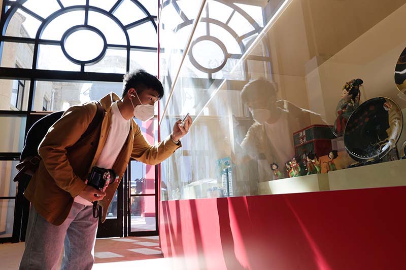 10月10日,观众在“奋进新时代”主题成就展第五单元“坚定文化自信 建设社会主义文化强国”展厅拍摄展示代表性非遗作品和文创精品的博古架。新华社记者 张玉薇 摄 “这组书柜展示了党的创新理论重要著作及研究成果、近年来重点主题出版物,这组博古架展示了70余件代表性非遗作品和文创精品……”在北京展览馆展出的“奋进新时代”主题成就展上,跟随讲解员的生动讲述,参观精彩纷呈的实物展陈和图文并茂的全媒展示,一幅新时代文化建设的宏阔画卷在人们眼前徐徐展开。