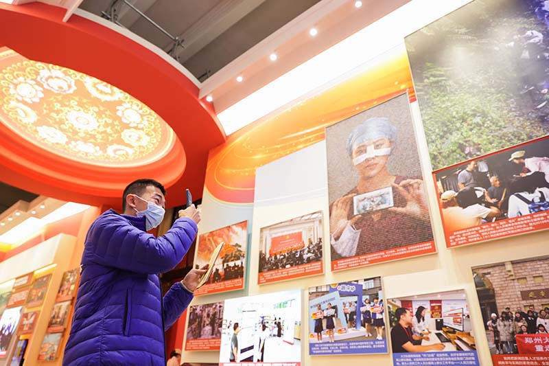 10月10日,观众在“奋进新时代”主题成就展第五单元“坚定文化自信 建设社会主义文化强国”展厅内参观。新华社记者 张玉薇 摄 坚持守正创新 中华文脉在赓续传承中弘扬光大 展览上,《复兴文库》展柜前,人们纷纷驻足观看这部刚出版的大型历史文献丛书。 “修史立典,存史启智,以文化人,这是中华民族延续几千年的一个传统。”习近平总书记为《复兴文库》作题为《在复兴之路上坚定前行》的序言。 在习近平总书记亲自关心推动下,中华文脉在赓续传承中弘扬光大,彰显出强大的生命力、凝聚力、影响力。 在展览的中央综合展区,良渚古城遗址公园全貌、泉州古城核心区鸟瞰图,以及粤绣、徽墨、景泰蓝等展陈令人目不暇接;《中国非物质文化遗产大辞典》反映我国非遗保护的实践经验、理论探索和突出成就;“何以中国”展览以视频方式呈现,依托一条浩丽江河的生动形象展现中华文明的起源、发展脉络和灿烂成就…… 在地方展区,“中国历代绘画大系”展现中国古代绘画的宏富成就;木雕《闽乡多锦绣》刻画福建省寿宁县下党乡的美丽景色;夏代早期粮仓造型再现2020年全国十大考古新发现之一的淮阳时庄遗址…… 在天津展区,杨柳青年画代表性传承人张宏正忙着给观众们制作年画作品。“这几年,国家对传统工艺的保护力度越来越大,社会关注度也很高。身在这个好时代,我们有信心让‘老手艺’焕发出新活力。”张宏说。 从《关于加强文物保护利用改革的若干意见》《长城、大运河、长征国家文化公园建设方案》等出台,到中华优秀传统文化传承发展工程深入实施;从深入开展文化资源普查梳理、摸清文化资源家底,到《记住乡愁》《典籍里的中国》《国家宝藏》《唐宫夜宴》等电视节目“圈粉”无数;从全国各地设立2500余家非遗工坊助力脱贫攻坚、乡村振兴,到我国以42项联合国教科文组织非遗名录项目位居世界第一……放眼神州大地,推动中华优秀传统文化创造性转化、创新性发展的实践蔚为大观,更多文物和文化遗产“活”起来。文明古国正自信地迈向文化强国。 《长津湖》《我和我的祖国》《大江大河》《鸡毛飞上天》《人世间》……展览上,一组优秀影视作品海报彰显新时代文艺风貌;读者在北京图书大厦品读红色经典图书,中国文联学雷锋文艺志愿服务团为雄安新区建设者举行慰问演出……一幅幅文化活动图片记录新时代精彩精神生活。 回应人民群众新需求新期待,10年来,我国深化文化改革发展,文化领域供给侧结构性改革深入推进,公共文化服务体系更加健全。截至2021年底,全国共有广播电视播出机构2542个,公共图书馆3215个,文化馆3316个,博物馆6183个。到目前为止,实现了所有公共图书馆、文化馆、美术馆、综合文化站和大部分博物馆免费开放。 坚持把社会效益放在首位、社会效益和经济效益相统一,文化事业、文化产业和旅游业全面发展,人民群众切身感受到“文化小康”带来的幸福感。